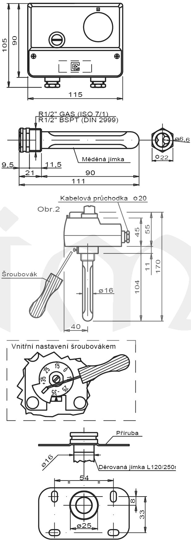 Termostat E1708 stonkový, rozsah termostatu 0-90°, s pojistkou 100°C, přepínací kontakty, s krytem IP40, jímka 100mm G1/2"