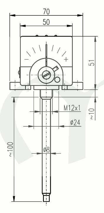 Vlastní termostat tvoří stonek a spínací hlavice. Stonek se skládá z dilatační trubky a invarové tyče. Spínací element je připevněn na výkyvném pravo­úhlém mostu, který je unášen dvěma spirálovými pru­žinami a jeho poloha proti invarové tyči se mění regu­lačním šroubem, jenž působí na jedno rameno výkyv­ného mostu. Vlastní spínací element tvoří dvě pruži­ny, kloubově spojené. Pro upevnění termostatu má základní deska dva nálitky s otvory. Při montáži je nutné, aby spodní díl spínací hlavice byl vzdálen od stěny tělesa asi 2 cm a tento prostor byl vyplněn izolační látkou tak, aby teplota spínací hlavice nepře­stoupila +120 °C.