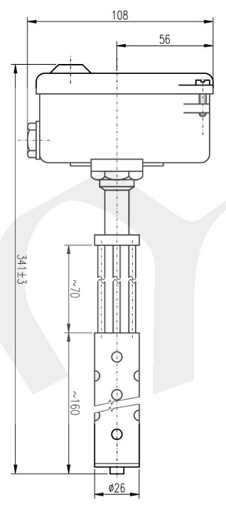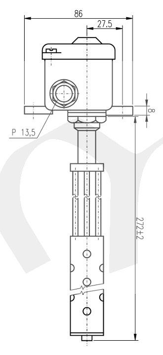 Teplotně citlivý element je stonek termostatu, tvořený dilatující trubkou z antikorozní žáruvzdorné oceli. Teplotní dilatace trubky se přenáší invarovou tyčí přes pákový převod na spínací mechanismus, který je uzavřen v hlavici. Regulační knoflík k nastavení teploty je rovněž uzavřen v hlavici a lze jej zaaretovat, aby vlivem otřesů nedo­šlo k přestavení vypínací teploty. Pro připevnění ter­mostatu slouží 2 patky s otvory pro šrouby. Při mon­táži nesmí být stonek mechanicky namáhán a musíbýt uložen tak, aby mohl dobře dilatovat. Termostat může být umístěn v libovolné poloze. Termostat je opatřen kabelovou ucpávkou P 13,5.