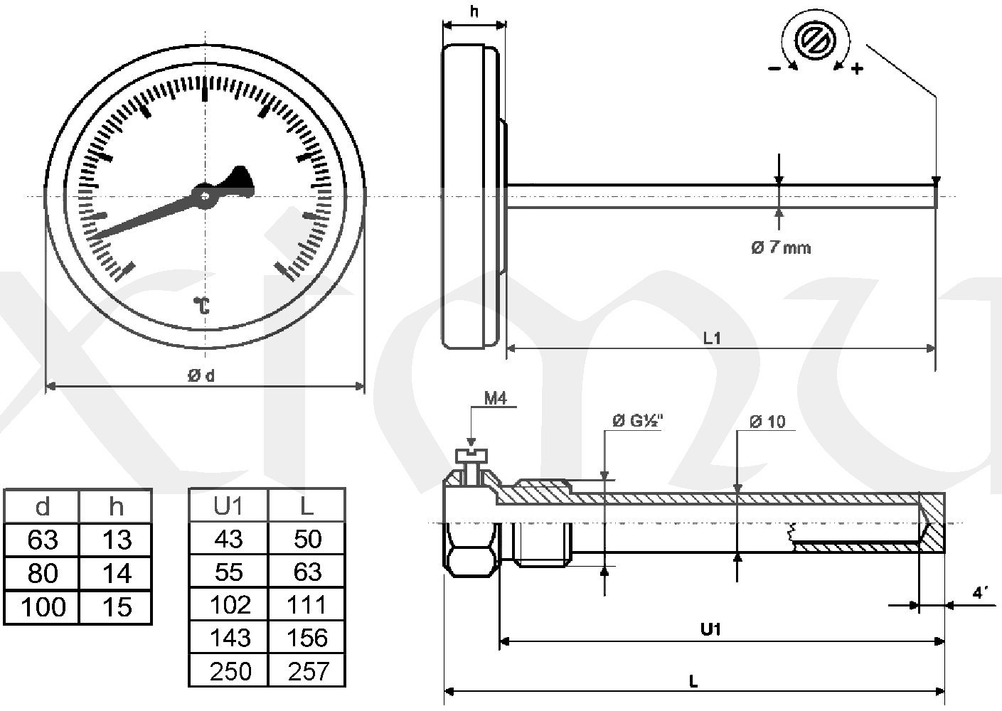Teploměr bimetalový přímý, zadní stonek, včetně Nerez jímky se závitem G1/2", L=100mm