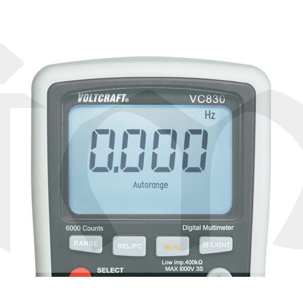 VC-830. Nová série multimetrů VOLTCRAFT®. Odolnost, spolehlivost, praktická výbava, ergonomický tvar, bezpečnost pro uživatele - to jsou atributy, jež specifikují tyto profesionální multimetry. Po stránce bezpečnosti se tento multimetr stává symbolem. Díky patentované konstrukci lze pouzdro pro výměnu baterie a pojistky otevřít pouze tehdy, když je přístroj odpojen od všech měřicích kabelů. Integrovaná funkce TLD® (Test-Lead-Detection) varuje uživatele v případě nesprávně připojených měřicích kabelů. Při vstupních napětích nad 30 V se na ukazateli objeví výstražný symbol. Multimetr má odolné pouzdro s ochranným nástřikem z měkké gumy.Jedinečnou koncepci bezpečnosti završují výkonové pojistky na 1000V se schopností odpojení proudu 30 kA a přepínaní impedance, které stisknutím tlačítka redukuje vstupní odpor kvůli zabránění chybným měřením díky rozptylovým napětím. K výbavě série patří optické rozhraní. Přístroj je schválen pro měření v kategorii přepětí CAT IV 600 V a CAT III 1000 V a zkoušen podle normy EN 61010.