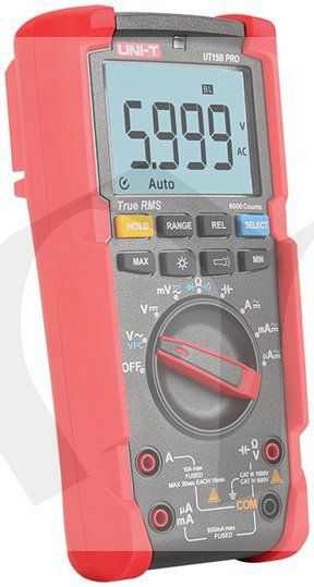 Tyto měřicí přístroje jsou dodávány s pozlacenými měřicími kabely pro rychlé a přesné měření. Multimetr UT15B PRO poskytuje ochranu v celém rozsahu do 1000 V, stejně jako ochranu proti přepěťovým špičkám napětí 8 kV, aby mohl odolat náhlým rázům vysokého napětí. Rozsahy mohou být přepínané automaticky nebo manuálně. Můžete využít automatického podsvícení displeje LCD, jehož maximální zobrazitelná hodnota je 6200. Možnost používání i v prostředí s elektrickým polem až 1V/m. Proudový rozsah μA a mA je jištěn rychlou pojistkou FF440 mA H 1000 V, ø10 x 38mm CE a proudový rozsah 10A je jištěn rychlou pojistkou FF11A / 1000V ø10 x 38mm CE. Napájení je provedeno dvěma kusy tužkových baterií AA R6 1,5V a přístroj se automaticky vypíná po 15ti minutách nečinnosti (funkci lze dočasně vypnout).
