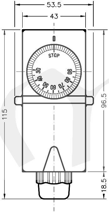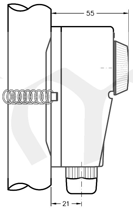 Jednopólový zakrytovaný termostat pro ovládání teploty využívající roztažnosti tekutiny, vybavený průchodkou kabelů a přepínacím kontaktem.