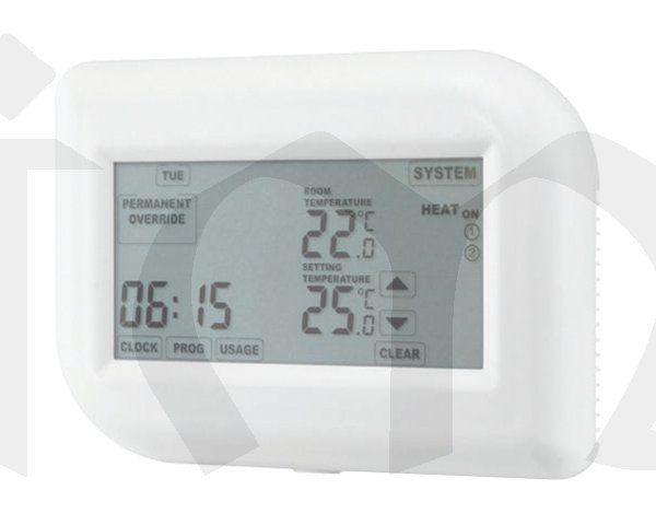 Programovatelný termostat pro regulaci vytápění, klimatizace nebo chlazení s dotykovým displejem. Nezávislý spínací kontakt umožňuje ovládat elektrické či plynové kotle, přímotopy atd. Velký podsvícený LCD displej zobrazuje nastavené parametrytermostatu, čas a teplotu. Týdenní časovač s nastavitelnými programy pro vytápění podle Vašich požadavků, ruční nebo automatické řízení. Režim zabraňující promrznutí.