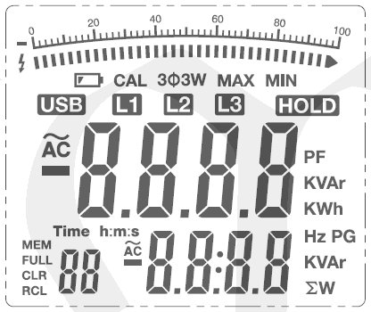 ♦ měří V, A, kW, kVA, kVAR, PF, cosfi, kWh, Hz