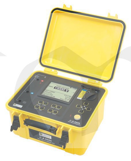 Měřič izolačních odporů C.A 6555 je robustní a vysoce odolný, spolehlivý a snadno použitelný přístroj. Díky variabilnímu testovacímu napětí od 40 do 15000V je ideální pro řešení mnoha problémů při uvádění zařízení do provozu a pro preventivní údržbářské aplikace. Nabízí automatické kvalitativní funkce jako je výpočet indexu polarizace (PI) a dielektrické absorpce (DAR) nebo měření dielektrické absorpce vícevrstvých dielektrik (DD). Integrovaný akumulátor napájí přístroj po velmi dlouhou dobu a usnadňuje provádění testů kdekoli potřebujete. Je vybaven grafickou obrazovkou, vnitřní pamětí a komunikací umožňující dodatečné zpracování výsledků v PC.
