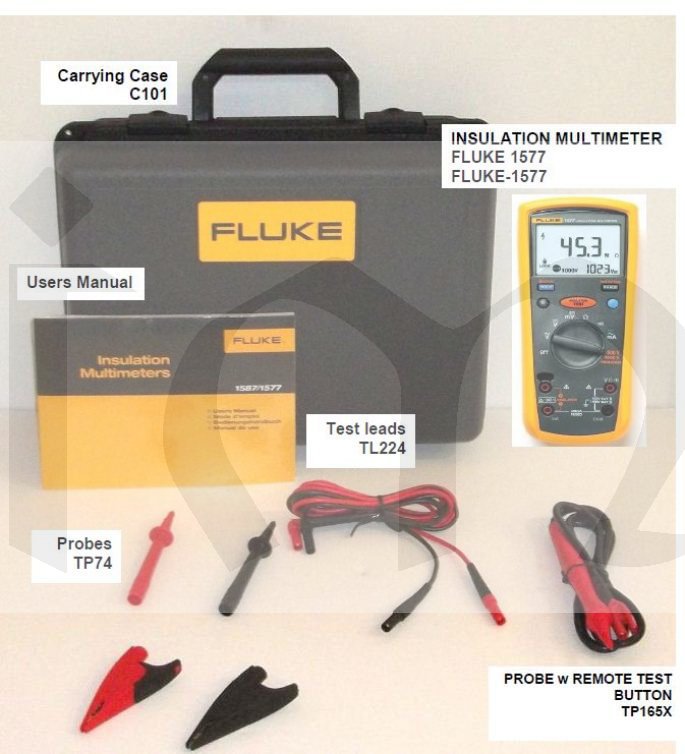 Multimetr s měřičem izolace Fluke-1577, sada měřicích vodičů TL224, sada měřicích hrotů TP74, sada krokosvorek AC285, sonda s dálkovým ovládáním TP165X, kufr C101, 4ks baterie 1,5 V a návod k obsluze v čj.