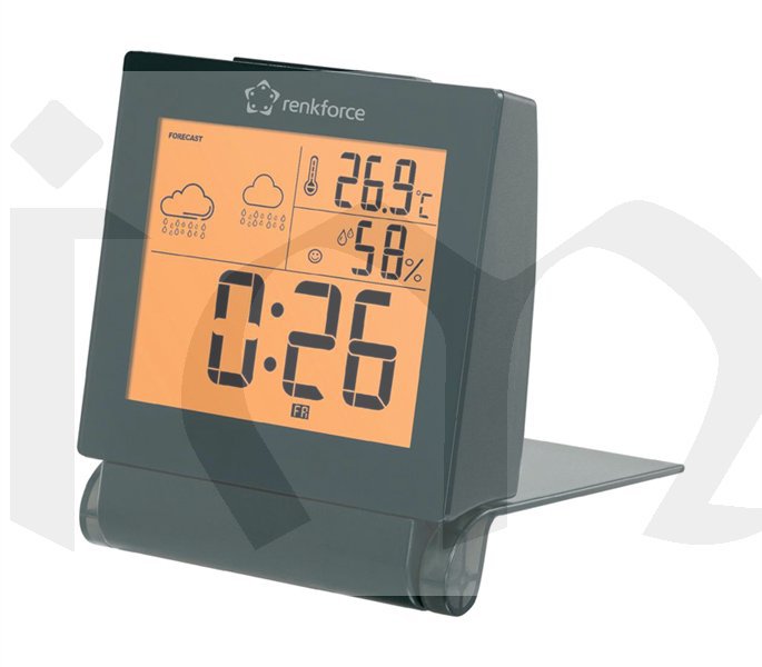Teploměr/vlhkoměr s předpovědí počasí. Skládací stojánek se dá použít také jako kryt displeje, takže vlhkoměr můžete vzít s sebou na cesty.