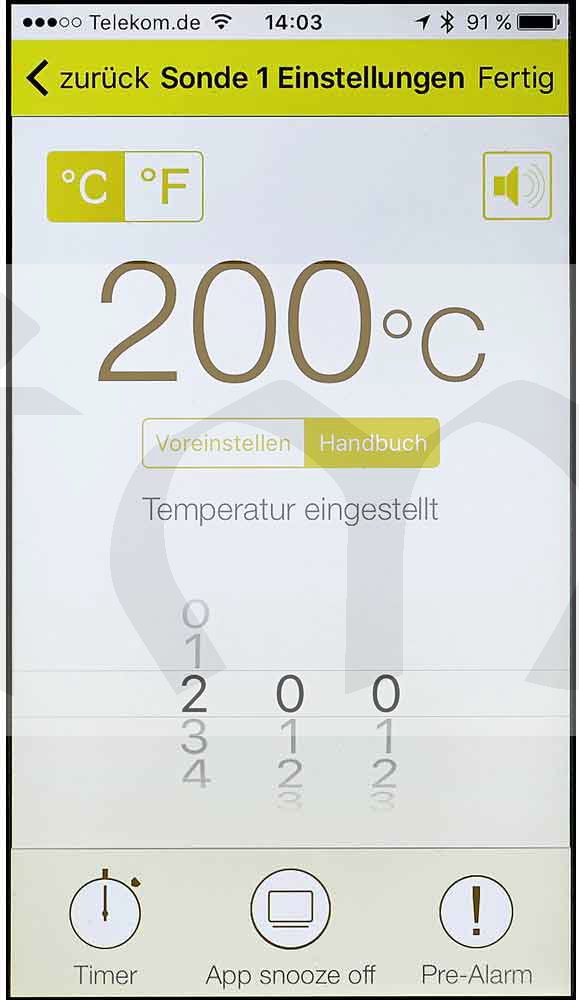 Obsluha a programování pomocí aplikace "Grill Smart". Aplikace může být nainstalována v zařízení Smartphone nebo tabletu s operačním systémem Android nebo Apple iOS. Spojení mezi zařízením a teploměr pomocí Bluetooth® 4.0 . Můžete si vybrat přednastavené teploty nebo si je nastavit podle sebe. Lze nastavit i dva časovače.