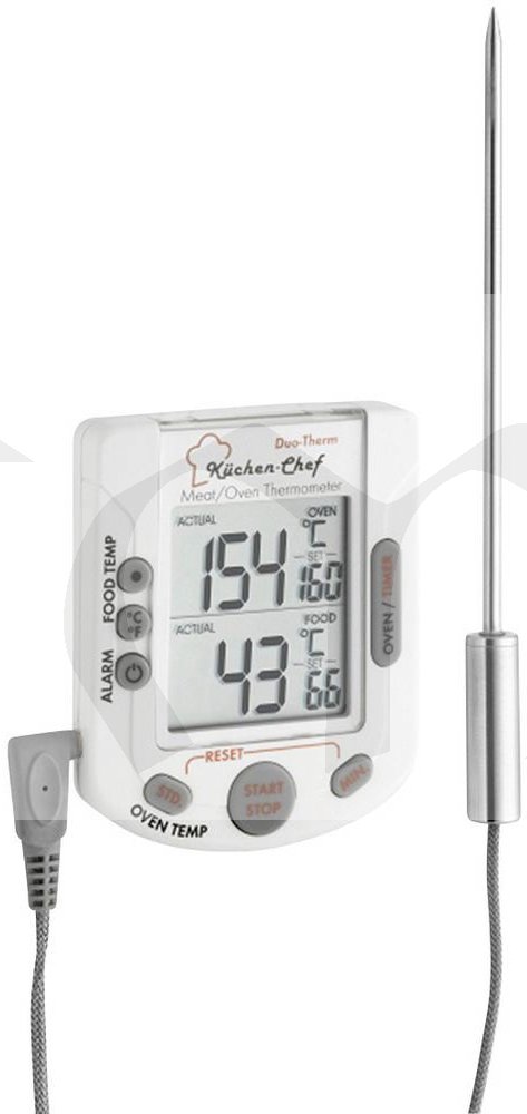 Digitální vpichový teploměr na maso 14.1503 KÜCHEN-CHEF je určený pro kontrolu teploty masa při jeho přípravě. Pomocí vpichového čidla teploměr zjistí aktuální teplotu uvnitř masa a v jeho okolí. Díky nastavitelnému teplotnímu alarmu Vás upozorní, jakmile je maso dostatečně upečené. Teploměr lze postavit na rovnou podložku nebo upevnit na zeď pomocí magnetu umístěného na zadní straně.