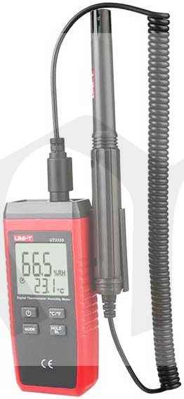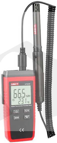 UT 333 S je přesný, bezpečný a spolehlivý digitální teploměr s vlhkoměrem a kompaktními rozměry. Displej je dělený a zobrazuje hodnotu teploty i vlhkosti současně, čímž usnadňuje měření v různých podmínkách a prostředích. Široce se využívá ve skladech obilovin, dopravě, archivech, zpracovatelství materiálu, lesnictví, chovech zvířat, zdravotnictví, vzdělávacích zařízeních, veřejném sektoru a domácnostech.