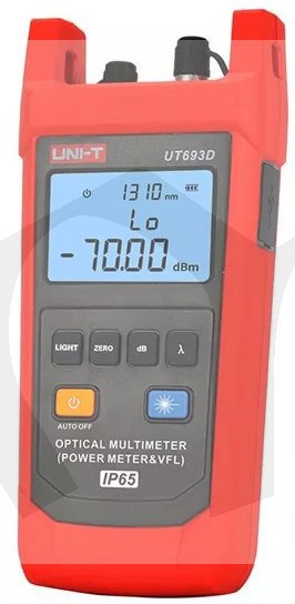 Optický multimetr UT-693D je vhodný pro konstrukci a údržbu optických kabelových tras, pro výrobu, instalaci, provoz a údržbu optických přenosových systémů, pro hodnocení optického zařízení v optickém inženýrství, laboratořích a výrobních závodech. Ruční tester optické energie UT693D slouží k měření absolutní optické energie nebo relativní ztráty optické energie v délce vodiče z optických vláken. Je navržen tak, aby vydržel pád ze 2m, je vhodný pro práci ve venkovním prostředí. Odolnost vůči prachu/vodě je IP65. Navíc disponuje podsvíceným displejem, automatickým vypnutím po 10 minutách nečinnosti. Oproti podobným testerům UT692D a UT692G může detekovat poškození optického vlákna do vzdálenosti 8 až 10 km.