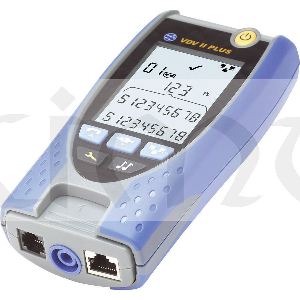 Moderní zkoušečka elektrického vedení se obsluhuje velmi jednoduše a dovoluje rychlé přezkoušení měděných kabelů od hlasové, datové a video instalace, jako je telefonní vedení, datové kabely, video a bezpečnostních sít v bytech, kancelářích a průmyslových prostorech. VDV II Plus ukazuje chyby vedení jako přerušení, zkrat, špatné zapojení a prohozené vodiče mezi páry, měří také délku kabelu a vzdálenost k přerušenému místu. K dispozici je připojení pro konektory RJ11, RJ45, koax F a BNC. Zkoušečka je vybavena velkým podsvíceným LCD displejem a integrovaným remote adaptérem na spodní straně přístroje.