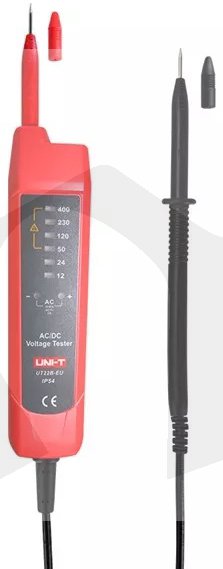 Přístroj UT-22B-EU je jednoduchý tester napětí pro každodenní, snadné používání pro elektrikáře a kutily pro měření přítomnosti AC/DC napětí na zásuvkách 230V, vypínačích a elektrických spotřebičích. Tento tester napětí má krytí IP54 proti vodě a prachu a je navržen tak, aby vydržel pád z výšky 2 metry. Skvělá věc na tomto produktu je, že nevyžaduje žádnou baterii, jeho napájení je zajištěno testovaným napětím! UT22B umožňuje rozlišit velikost napětí od 12V do 400V (počtem svítících diod LED) a automaticky rozlišovat mezi stejnosměrným a střídavým napětím (svítí indikátory "+" nebo "-" nebo oba současně). Přesnost indikace úrovně napětí : příslušná LED se obvykle plně rozsvítí při přibl. 70% až 100% uvedeného rozsahu, s výjimkou rozsahu 12 V AC/DC, kde se rozsvítí již při 50% až 100% hodnoty napětí. Přístroj odpovídá normám: EN61326-1: 2013, EN61326-2-2: 2013, EN61243-3: 2014.