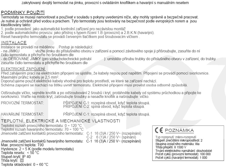 Termostat E1708 stonkový, rozsah termostatu 0-90°, s pojistkou 100°C, přepínací kontakty, s krytem IP40, jímka 100mm G1/2"