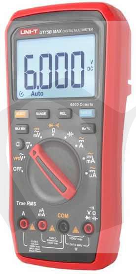 UT15B MAX je spolehlivý digitální multimetr typu true-RMS. Přístroj je navržen tak, aby odolával rušení, a dokáže odfiltrovat rušení od nosné frekvence překryté sinusovým signálem nebo signálem různého zkreslení napětí a je schopen merit výstupní napětí pohonu s proměnnou frekvencí. V režimu stejnosměrného/ střídavého napětí muže měřič provádět měření frekvence a pracovního cyklu. Řada multimetrů MAX dosahuje ochrany proti falešné detekci a alarmu při nesprávném připojení ke vstupní svorce v aktuální poloze, což uživateli zajištuje bezpečnou práci.