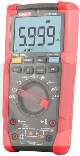 Digitální multimetr UT15B PRO 1000 V True RMS je vysoce spolehlivý, bezpečný a odolný multimetr, měřící skutečné hodnoty RMS, určený i pro měření v rozvodných zařízeních kategorie CAT III 1000 V / CAT IV 600 V. Multimetr je vybaven vestavěným filtrem VFC a dokáže odfiltrovat rušení vznikající například na měničích napětí, což vede k přesnějšímu odečtu napětí.