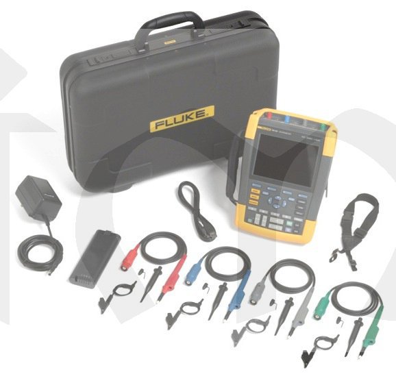 Scopemetr Fluke190-104, 4ks stíněných sond VPS410 (červená, modrá, zelená a šedá), Li-ion baterie BP291, USB kabel, software FlukeView SW90W, kufr C290, síťový adaptér a návod k obsluze na CD v českém jazyce