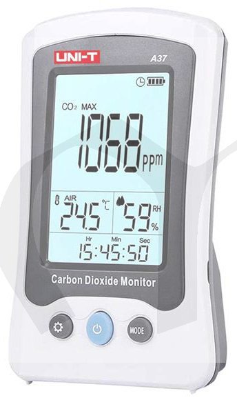 A37 monitoruje množství oxidu uhličitého, teplotu a relativní vlhkost vzduchu. Tento přístroj může být široce používán v domácnostech, kancelářích, vozidlech, laboratořích, kancelářích, hotelech, školách, továrnách, konferenčních místnostech, na letištích, v nemocnicích, restauracích, nákupních centrech a na mnoha dalších veřejných místech. Rozsah měření CO2 je od 400ppm (0,04%) do 5000ppm (0,5%). Přístroj má automatickou kalibraci CO2 a hodnotu CO2 následně měří 1x za 3 sekundy a má možnost nastavení systémového času a data. Pak lze pomocí krátkého stisknutí tlačítka MODE zobrazit pozastavená dat (HOLD), nebo maximální a minimální (MAX a MIN) hodnoty, nebo průměrné hodnoty (AWG), nebo průměrné vystavení osob CO2 na pracovišti během 8hodinového pracovního dne nebo 40hodinového pracovního týdne (funkce TWA), nebo přijatelný limit vystavení CO2 po krátkou dobu (časově vážený průměr), obvykle 15 minut (funkce STEL). Hodnoty CO2 se indikují také v šesti úrovních pomocí emotikonů.